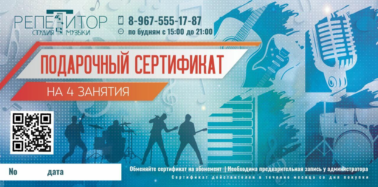 У студии музыки «репеТитор» есть замечательный подарочный сертификат на занятия гитарой, вокалом, барабанами, фортепиано и даже аккордеоном! Это действительно идеальный подарок для всех, кто любит музыку и хочет научиться играть на инструменте или улучшить свои навыки.